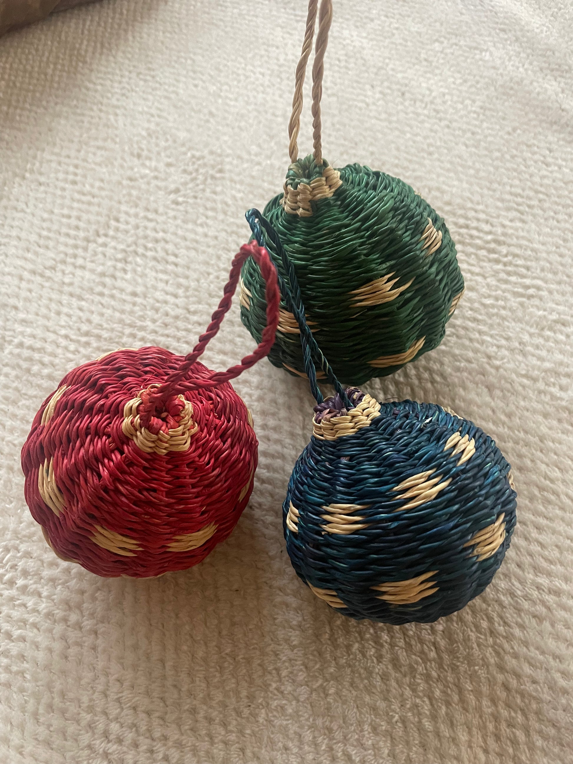 De kerstballen zijn gevlochten van olifantsgras, wat zeer soepel, stevig en duurzaam is.